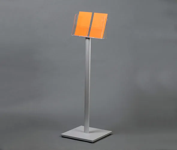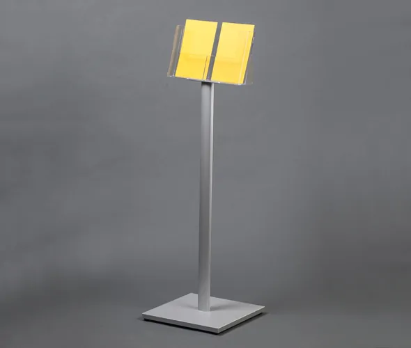 Clear styrene floor standing 2 x A5 portrait pockets side by side with grey powder coated pole and base. 1080mm overall height