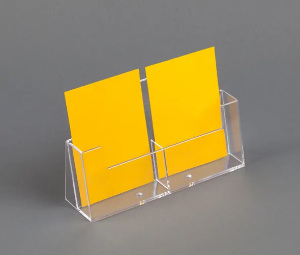 Clear styrene A6 portrait two pocket (side by side) leaflet dispenser designed for counter top display.Introducing our Dual Pocket A6 Portrait Leaflet Holder, a stylish way to organize and promote literature on countertops. Unlike traditional tiered dispensers, this leaflet holder has side-by-side pockets for a unique and eye-catching countertop display. Perfect for portrait postcards, pamphlets, or informational materials, this leaflet holder is a must-have for businesses looking to streamline their countertop display.