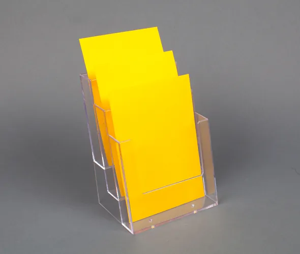 Clear styrene 3 tiered pocket A5 leaflet dispenser for counter top display.Our Three-Pocket Tiered Leaflet Holder is the perfect choice for presenting your A5 size brochures in an organized and visually appealing manner. Whether you run an office, exhibiting in trade shows, or managing a retail environment, this holder will help you present your marketing literature professionally. Key Features: