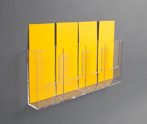 Clear styrene 4 pocket 1/3 A4 pockets side by side for wallmounting or can be adapted to freestanding with the supplied additional clip.