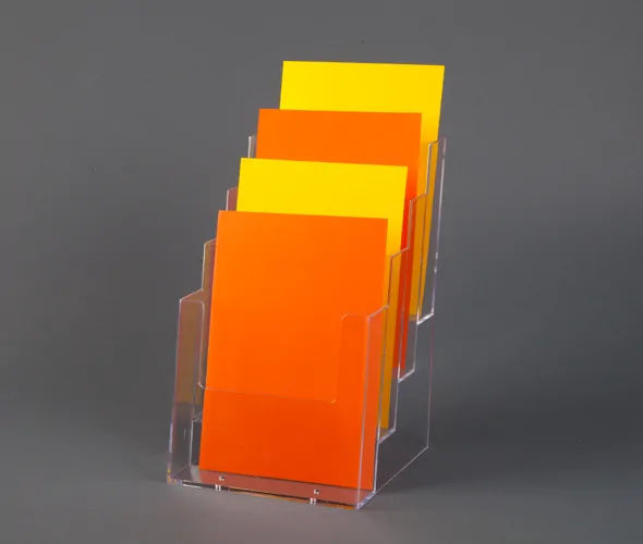 Clear styrene 4 tiered A5 dispenser for wall mounting or free standing display.Our Four-Pocket Tiered Leaflet Holder is the ultimate choice for displaying your A5 size brochures in an organized and visually appealing manner. Whether you manage an office, exhibit at trade events, or manage a retail store, this holder will help you display your marketing literature professionally. Key Features: