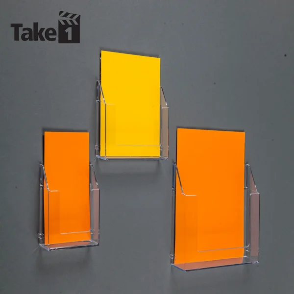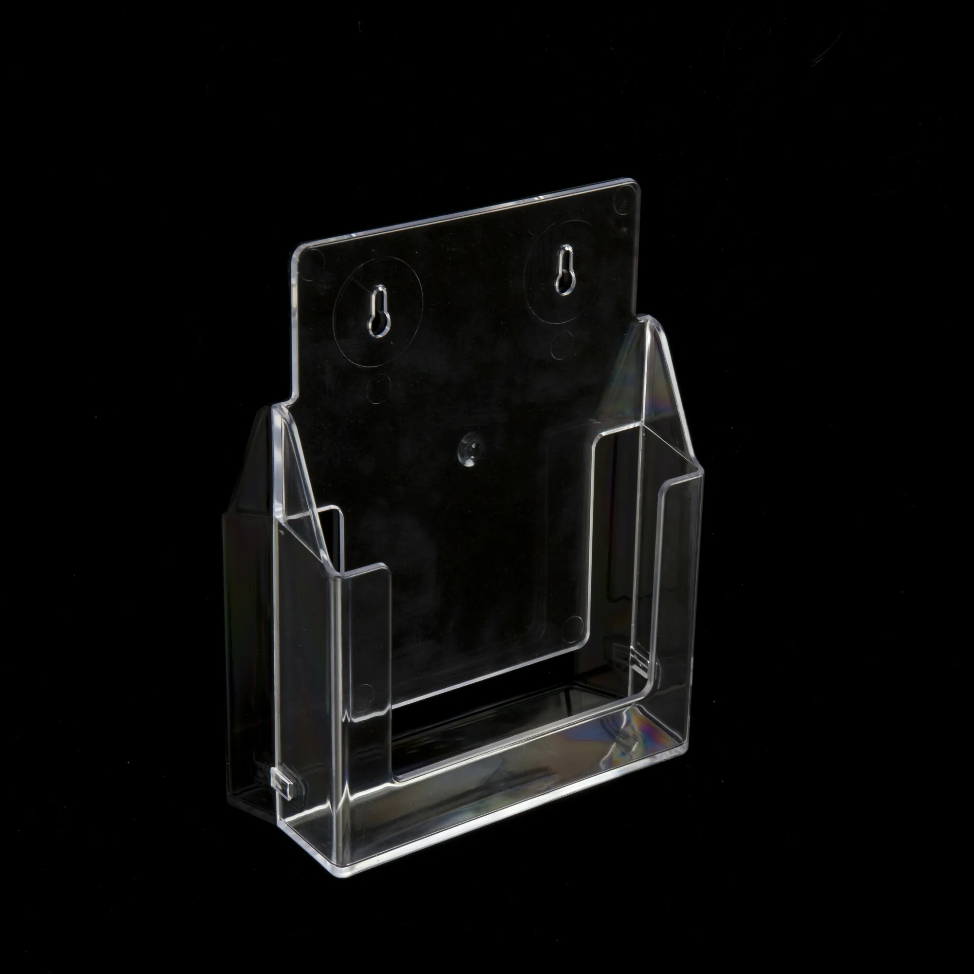 Clear A4, A5 and 1/3rd A4 flat back, high strength (high molecular weight) styrene, portrait leaflet dispensers for screw mounting directly to display material or wall. Our lowest-cost rigid dispenser