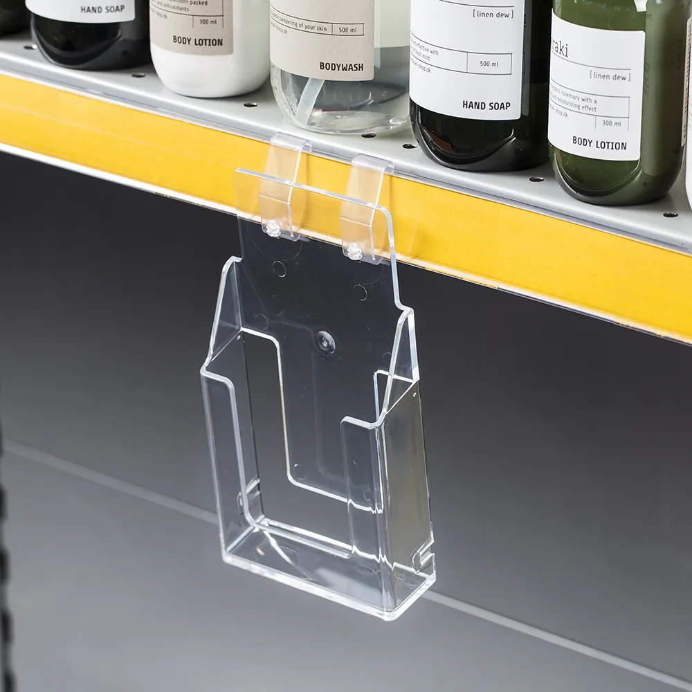 A4 DL shelf-mounted leaflet holders are specifically designed to accommodate DL-sized leaflets (99mm x 210mm) in an A4-sized (106mm wide x 200mm high) display. These holders are ideal for showcasing slimline leaflets price lists, and other narrow-format literature in an organised and space-efficient manner. Perfect for retail stores, they provide a professional display while keeping materials easily accessible to customers and visitors. Constructed from high-quality, durable clear styrene, these holders offer a long-lasting and stylish way to present printed materials.