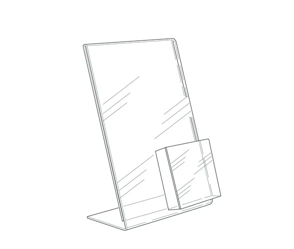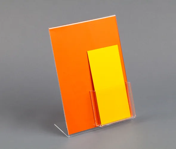 Clear A4 freestanding angled sign holder with 1/3rd A4 (DL size) attached, manufactured from 2mm acrylic and finished with a polished edge. Angled portrait counter top display for maximum visibility. Literature slides in from the side to quickly change your signage as required. The pocket is designed to hold 1/3rd A4 size paper and has an internal depth of 25mm
