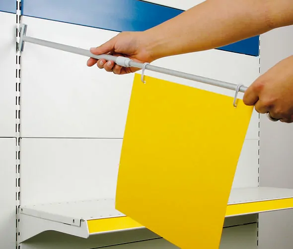 Zinc plated metal banner hanger for slotting into standard Tego uprights. Adjustable 10mm diameter telescopic aluminium tube with 350mm hanging area, includes x 2 clear hooks for displaying hanging signs and panels. 750mm overall length