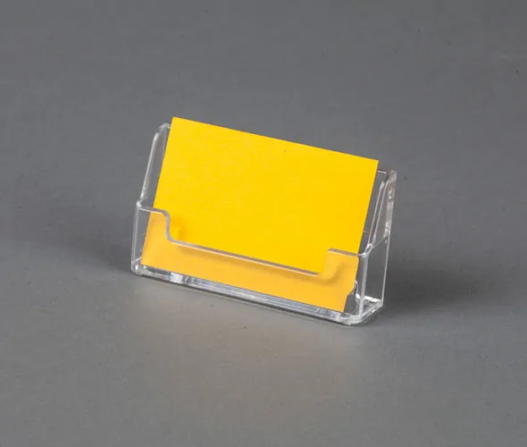Clear styrene freestanding business card holder for counter top display. Designed to hold standard business card neatly in place