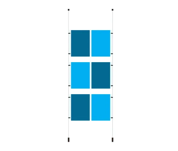 Kit comprises 2 x 4000mm stainless steel cables, 1.5mm diameter thick. Supplied with top and bottom fixings, Allen keys and fixing screws, 3mm acrylic poster pockets are the appropriate number of satin anodised aluminium clamps to attach the pocket to the cable