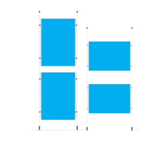 Kit comprises 2 x 4000mm stainless steel cables, 1.5mm diameter thick. Supplied with top and bottom fixings, Allen keys and fixing screws, 3mm acrylic poster pockets and the appropriate number of satin anodised aluminium clamps to attach the pocket to the cable
