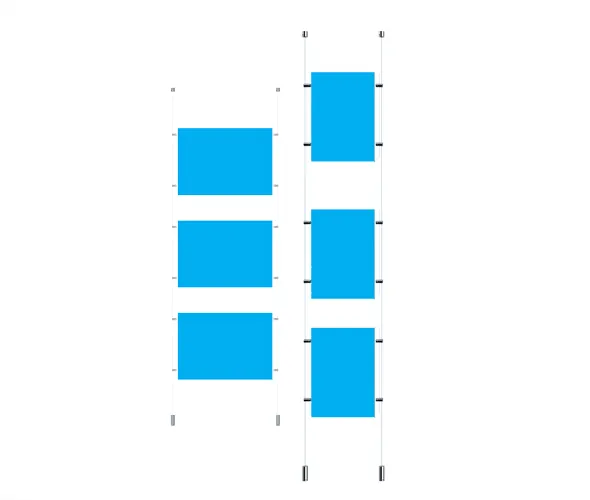 Kit comprises 2 x 4000mm stainless steel cables, 1.5mm diameter thick. Supplied with top and bottom fixings, Allen keys and fixing screws, 3mm acrylic poster pockets and the appropriate number of satin anodised aluminium clamps to attach the pocket to the cable