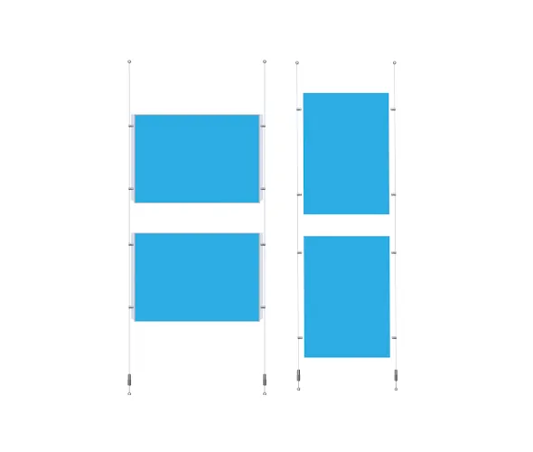 Kit comprises 4000mm stainless steel cable, 1.5mm diameter thick and tensioner. Supplied with 19mm diameter top and bottom fixings, Allen keys and fixing screws, 2 x A3 (portrait or landscape 3mm thick acrylic poster pockets) for wall mount display and the appropriate number of satin anodised aluminium clamps to attach the pockets to the cables