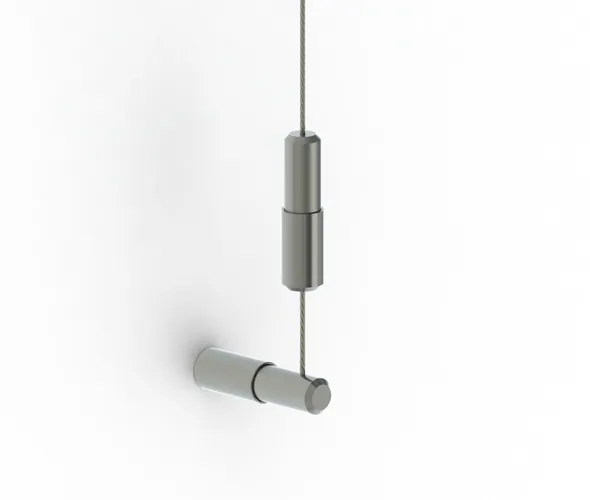 Kit comprises 2 x 4000mm stainless steel cables, 1.5mm diameter thick and tensioner. Supplied with top and bottom fixings, Allen keys and fixing screws, 3mm acrylic poster pockets and the appropriate number of satin anodised aluminium clamps to attach the pocket to the cable
