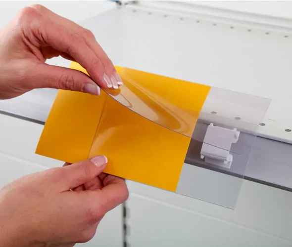 White or black polypropylene double hinged 25mm wide ticket rail clip with 5mm hole for additional secure fixing. Fits into 38-40mm ticket rail 'A' side and 25-31mm ticket rail 'B' side. Takes a 25mm square adhesive pad (not supplied). Photographed with our 124-100 Spring Hinge Sign Holder