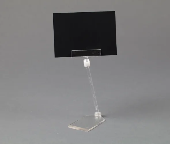 Clear plastic card holder with 100mm stem. 40mm x 75mm base and 50mm wide card holder. Accepts material up to 1mm thick. Supplied unassembled