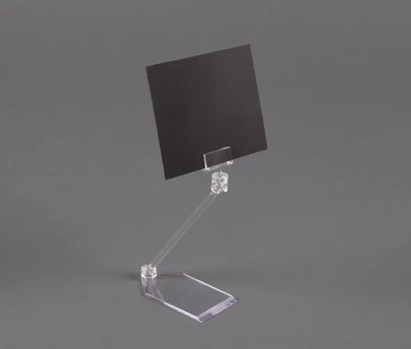 Clear plastic card holder with 100mm collapsible stem for flat pack distribution. Supplied unassembled. 40mm x 75mm base and 27mm wide card holder. Accepts material up to 1mm thick. Bagged in 10's
