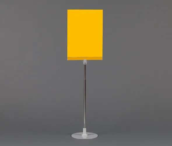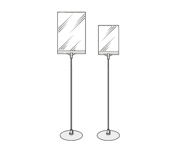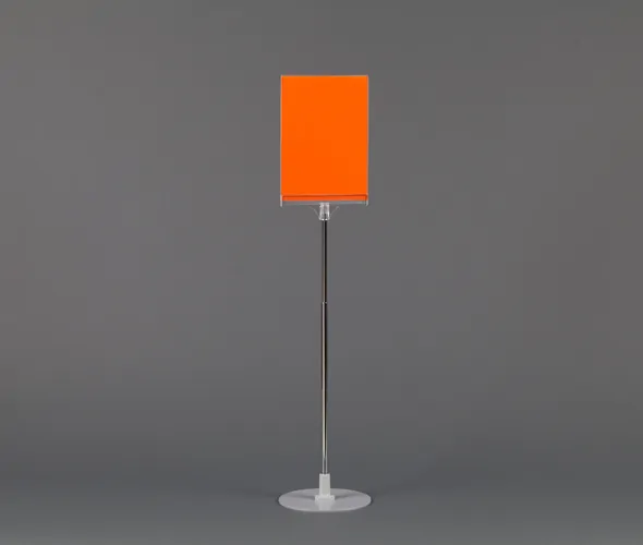 Clear acrylic sign holder with stand. Twist and lock adjustable steel tube which extends from 320-620mm. Supplied with a silver grey heavy duty 160mm diameter round metal base and 150mm wide clear t-piece to hold an A5 or A4 acrylic sign holder