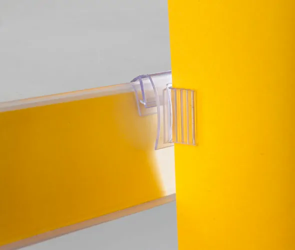 Clear co-extruded PVC Supergrip with flexible hinge clip over or under scanner rail to hold sign at 90 degree.Introducing the Grip Hinged Data Clip, a versatile and secure solution for displaying signs and information on scanner rails. This clear co-extruded PVC Supergrip features a flexible hinge, making it easy to clip over or under the rail, offering a professional way to present pricing, product details, and promotions at a perfect 90-degree angle.