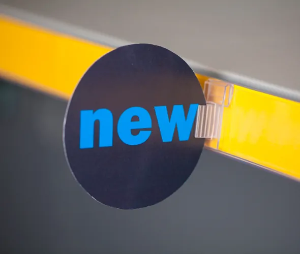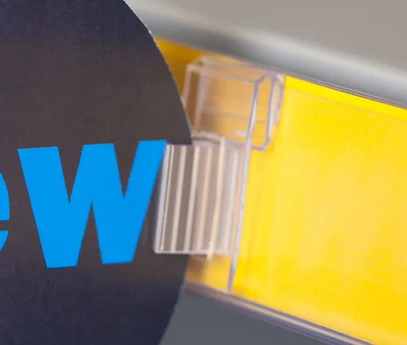 Clear co-extruded PVC Supergrip with flexible hinge clips over front of scanner rail to hold sign at 90 degrees. Accepts material up to 1.5mm thick. 19mm wide