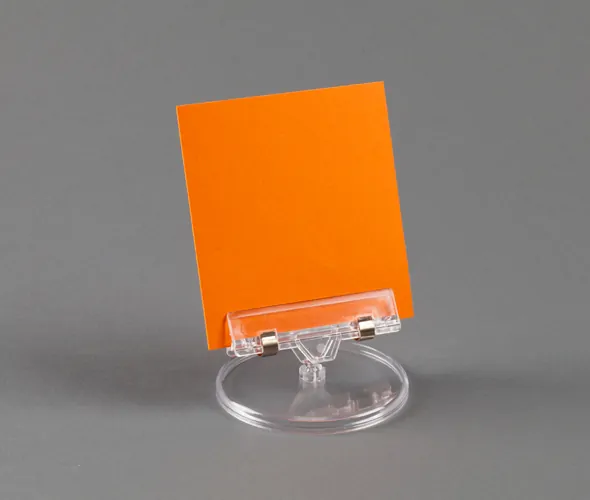 Clear plastic 80mm wide spring sign holder on a 85mm diameter wide base. Supplied unassembled