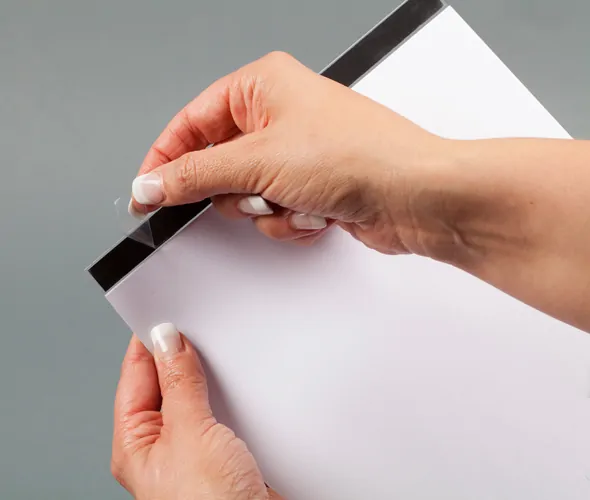 Clear PET UV protected double sided reusable sign holder. After years of research this product uses a fantastic new adhesive tape that holds posters on any smooth surface. The product can be removed and reused over and over again without it losing adhesion and without leaving any residue behind. Simply