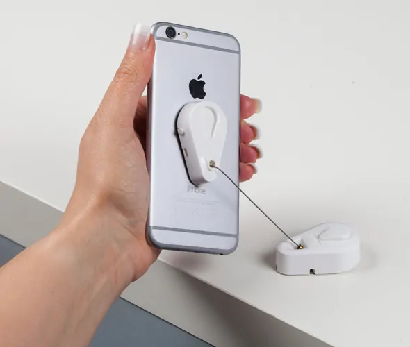 White ABS case housing a spring loaded retractable 900mm length cable. The internal magnet draws both halves together and settles in position when retracted.Introducing our Magnetic Retractable Security Tether System with Interlocking Cases, a versatile and secure solution designed to enhance organization and prevent loss. This innovative system combines the convenience of a retractable tether with the strength of magnets, ensuring your merchandise stays put and easily accessible.