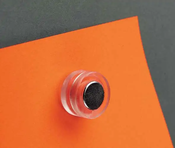 Mini neo magnet with clear polycarbonate case and spigot for mounting 3mm diameter punched material. Supports loads up to approx 1.2kg. 16mm diameter