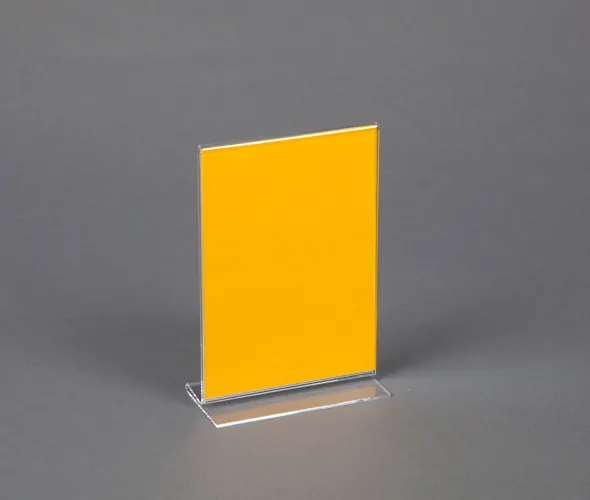 Clear A7, A8 and A9 freestanding straight sign holder, manufactured from 2mm acrylic. Double sided counter top display for maximum visibility. Literature slides in from the side to quickly change your signage as required