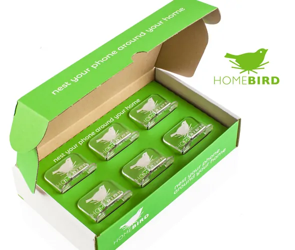 Nest your phone around your home! HomeBird clear, black or white polycarbonate smart phone holder - boxed in set of 6. Perfect as gift set. Designed for most smart phones or tablets. 57mm (W) x 40mm (H) x 54mm (D)