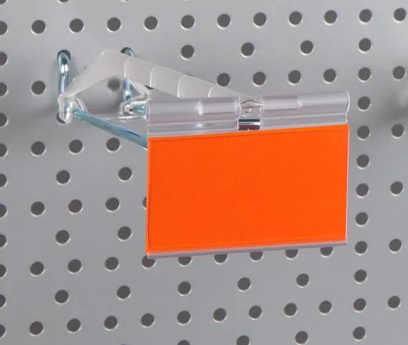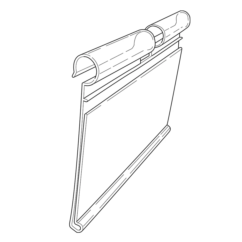 Clear extruded PVC label holder perfect for displaying prices or promotion information. Designed to be used with our Hook Overarms or fits onto metal merchandising hooks with 'T' ended overarms.Enhance your merchandising strategy with our Clear PVC Price Ticket Holder for Merchandising Hook Overarms, purpose-built to fit seamlessly with our Hook Overarms. This clear PVC holder is designed to accommodate 39x65mm pricing tickets and offers a secure solution for displaying important pricing information. It easily clips onto the T-bar at the front of the overarm and can be flipped up when needed, ensuring that your pricing ticket remains intact when merchandise is removed from the hook.