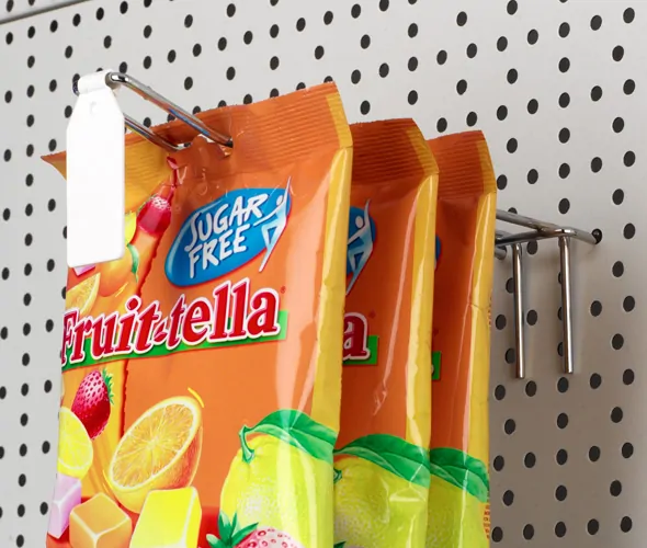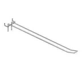 Bright zinc finish metal merchandising hook with fixed bridge specifically designed to be slotted ina 25mm hole spacing panel. 4.8mm diameter wire- Looped merchandising hook in polished zinc