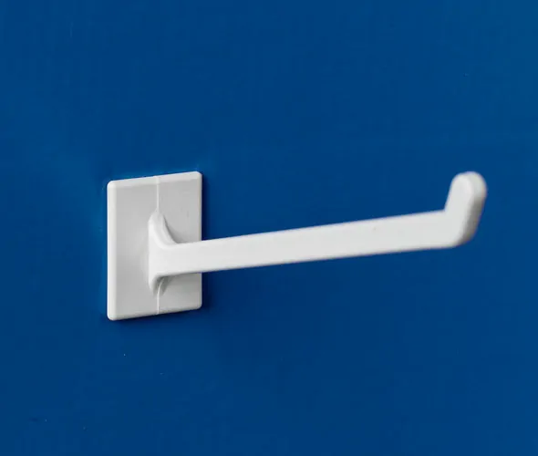 White styrene merchandising hook easily inserted into corrugated or plastic display boards with die cut out 'T' slot