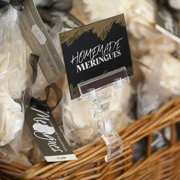 Clear polycarbonate sign holder that grips onto bowls or cartons. 80mm wide card holder with ratchet angle adjustment. 100mm high
