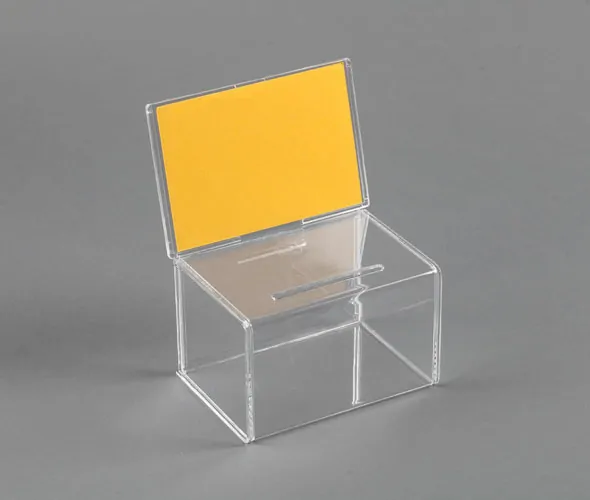 Clear acrylic freestanding suggestion box for counter top display. Perfect for capturing response slips, business cards, donations or suggestions and is specifically designed in clear acrylic so the contents is kept visible, encouraging customers to participate Discover our Compact Clear Acrylic Suggestion Box, a versatile and eye-catching solution designed for counter-top display. Key Features: