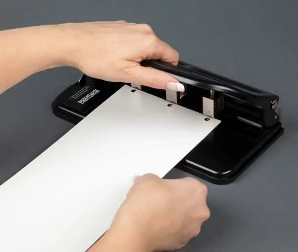 Hand operated three hole punch with adjustable punch positions and Printlock template