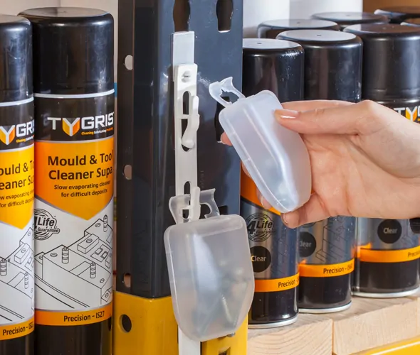White acetal clip that fits into the keyhole slot on most upright racking systems and is designed to securely hold our Double Duty Merchandising Strip rangeDiscover our innovative white acetal retail Racking Clip, designed here at Alplas to perfectly fit into the keyhole slot of most upright racking systems. Engineered specifically to securely hold our Double Duty Merchandising Strip range, these clips ensure a reliable and stable display for your products.
