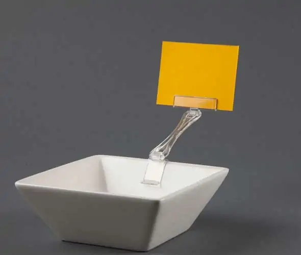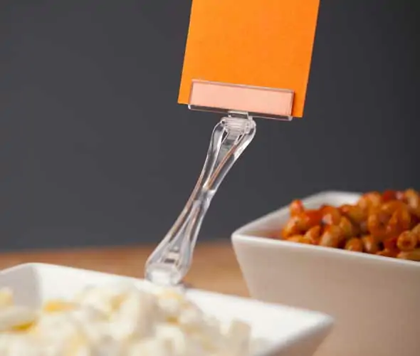 Clear polycarbonate card holder that clips to bowls and cartons. Arm is fully adjustable via ratchet to both ends. 150mm high and accepts material up to 0.75mm thick