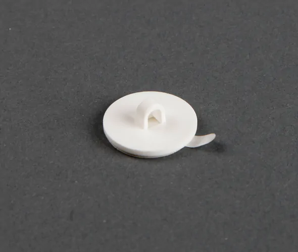 White polypropylene self adhesive button with loop. Peelable adhesive . 20mm diameter