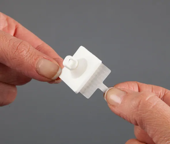A low cost white polypropylene ceiling button with eyelet that rotates 360 degrees and self adhesive fingertab for fast and efficient application. Loop accepts 2mm diamter wire. 25 x 25mm.