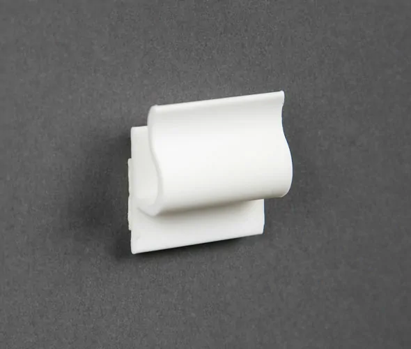 White styrene clip with adhesive pad. Fits in all standard slatwall grooves.