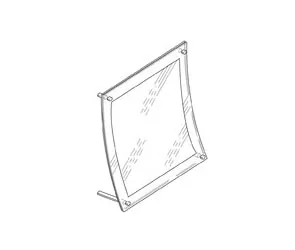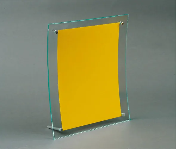 Clear A4 acrylic freestanding curved sign holder, manufactured from 2.5mm acrylic and finished with a green tinted bevelled edge that looks like real glass. Curved counter top display for maximum visibility. Sign holder can be displayed portrait or landscape, as the removable metal dowels unscrew to change orientation- A4