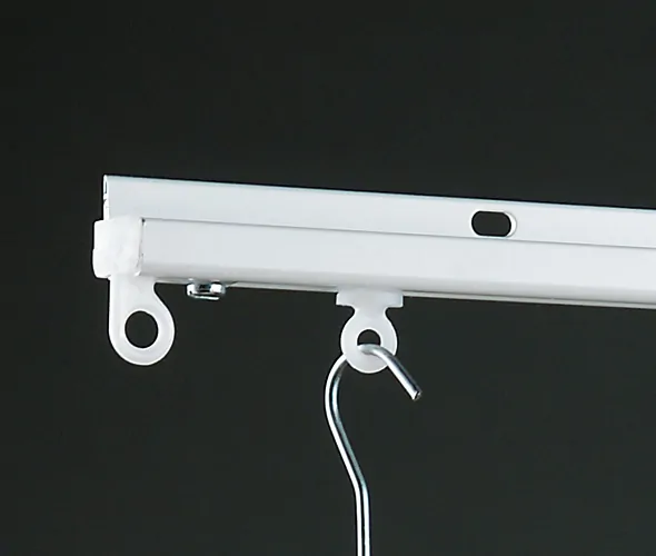 White powder coated aluminium track with 24 easy glide hangers and 2 end stops. With pre-drilled holes for top ceiling fixing
